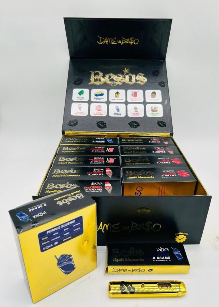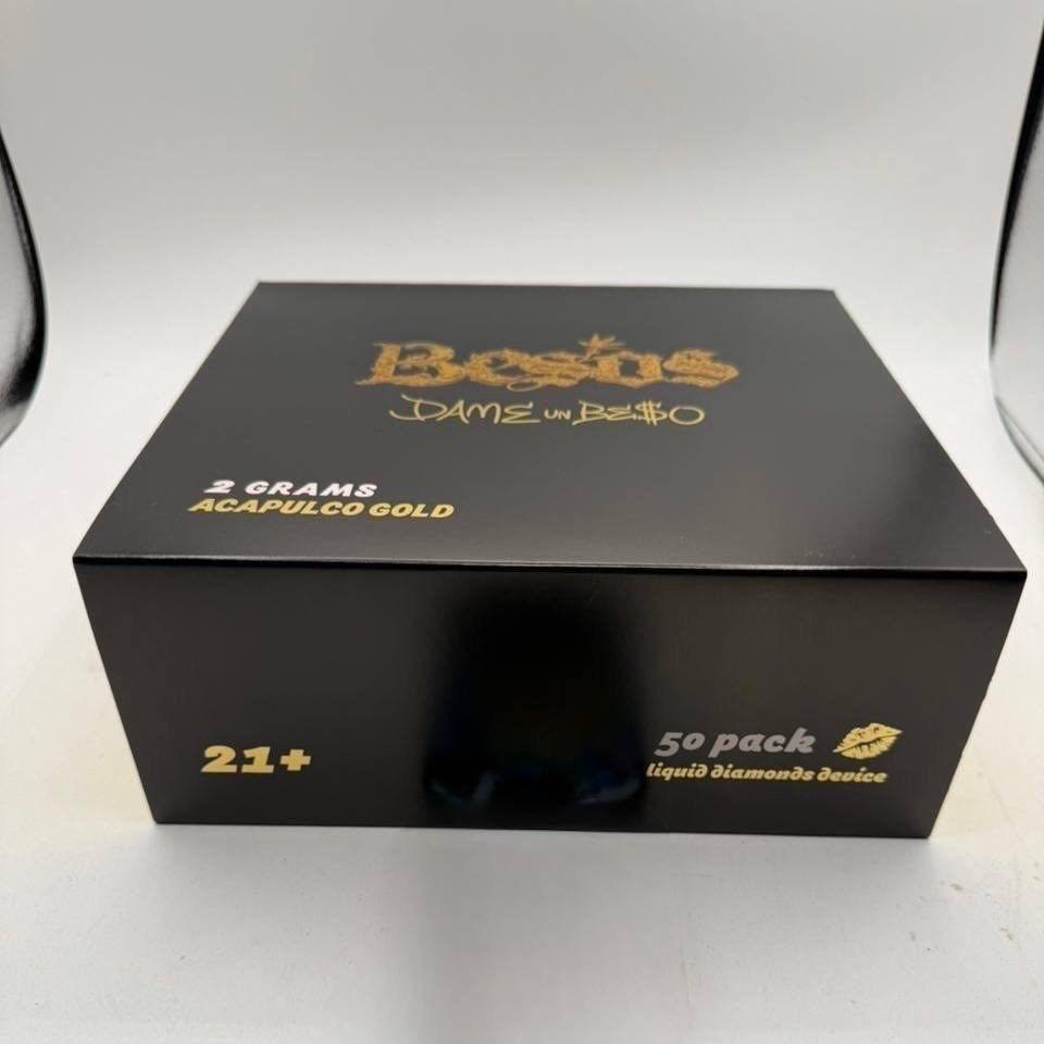 The Besos Dame un Beso Gold Edition is a premium 2 grams Liquid Diamond disposable vape crafted for connoisseurs who want a potent, flavorful, and effortless experience. Engineered around a luxurious live-resin “liquid diamond” formula, this limited-edition disposable combines THCa crystals (the “diamonds”) suspended in a terpene-rich sauce harvested from fresh-frozen Acapulco Gold genetics. Housed in a sleek, gold-accented battery and mouthpiece, the device is ready to use out of the box and designed to deliver smooth, aromatic draws with pronounced flavor and sustained effects. From the first inhale the Dame un Beso invites you into a heightened sensory moment — sweet, resinous, and unmistakably refined.